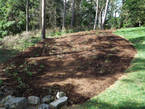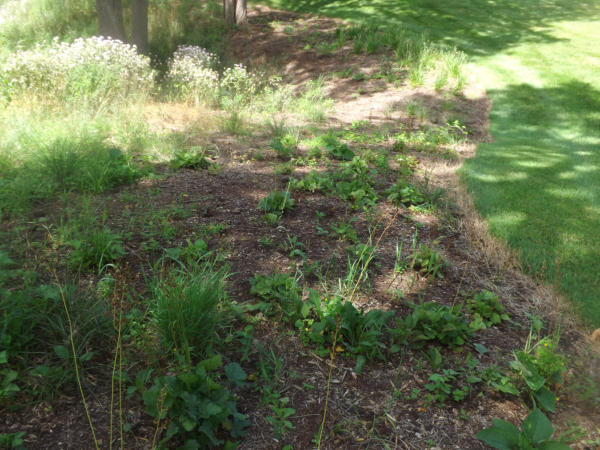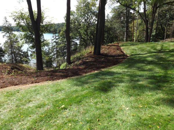 Dunham’s Lake BluffThe homeowner desired to improve the panoramic view of the lake by cutting back a lot of "wild growth" along the edge of the overlooking lake bluff.The area was prepared by eradicating the unwanted growth and covering the area with a bio-degradable weed barrier followed with 3-4"of hardwood mulch.The challenge on this site was to find native grasses and plants that would resist deer browsing and live under a canopy of Black Walnut trees.The plantings were installed in Sept 2013, so initially not a lot to see, but by end of season 2014 it should be spectacular.