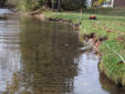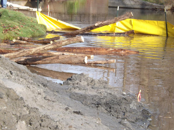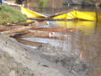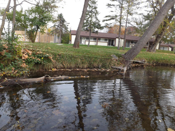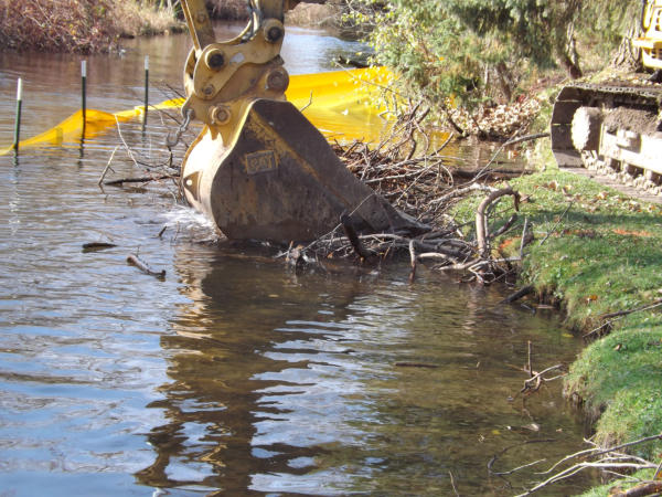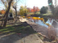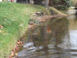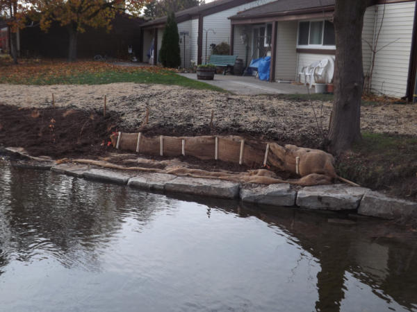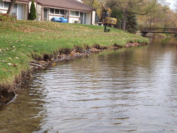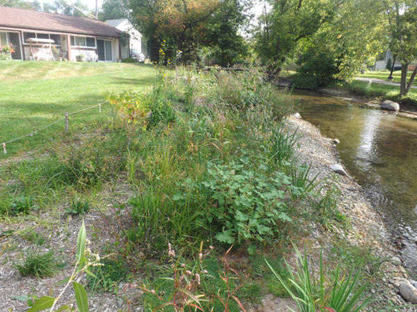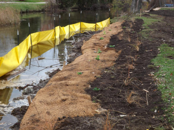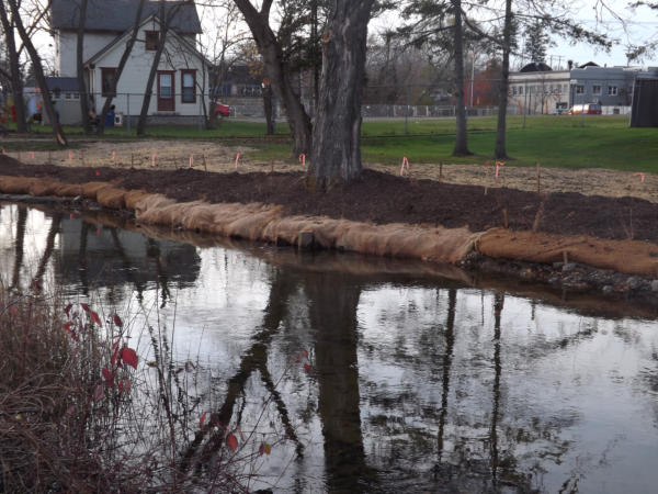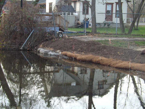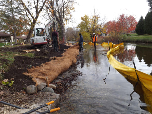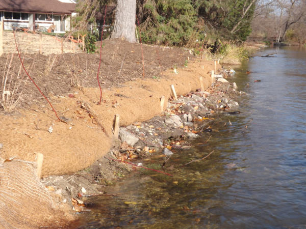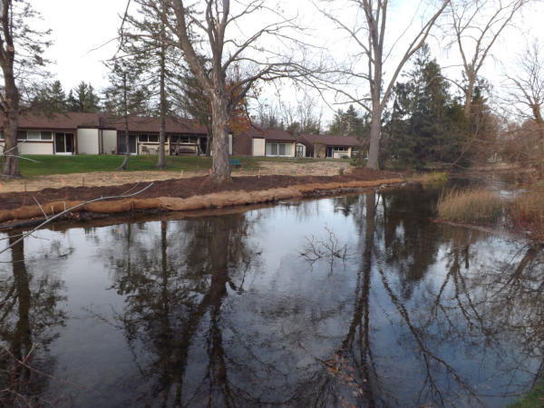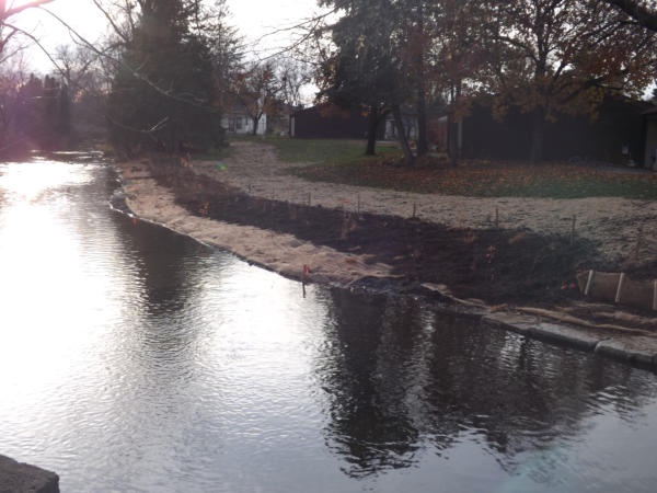 Paint Creek Project 2014- Shoreline Restoration This project involved the restoration and erosion control of approximately 500’ along Paint Creek in downtown Lake Orion across from Meeks Park. The creek shoreline had eroded away as much of 10’ of its bank in different areas. The habitat and flow of the creek was being marginalized because of lack of riparian buffer plantings and toe protection. A number of techniques were employed to improve the north shore of the creek. A tree vane was installed upstream and a flat stone vane was installed downstream to help direct flow and collect sedimentation. Several soil lifts were installed and hundreds of shrubs and herbaceous plants were used. Repurposed trees and branches were used to re-establish the shoreline and reshape the flow of the creek. Riprap was installed as needed to protect toe erosion. Habitat such as riffles, pools, & lunkers were created as well.